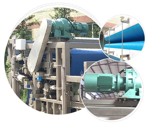 強(qiáng)力對(duì)輥壓渣脫水,經(jīng)過(guò)高壓強(qiáng)力對(duì)夾輥擠壓,使污泥達(dá)到較大程度的固液分離。