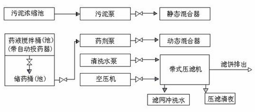 對(duì)于不同類型的污泥,液壓采用不同種類的絮凝劑及其投加濃度、用量以及擠壓輥數(shù)、擠壓方式 的不同排列,和濾帶的不同結(jié)構(gòu)、速度、張力的變化,來(lái)取得更加科學(xué)合理喲濟(jì)適用的處理效果。因此,要取得良好的脫水效果,針對(duì)不同成份、不同濃度、不同酸、堿度的污泥,必須設(shè)計(jì)一個(gè)相對(duì)應(yīng)的工藝流程。