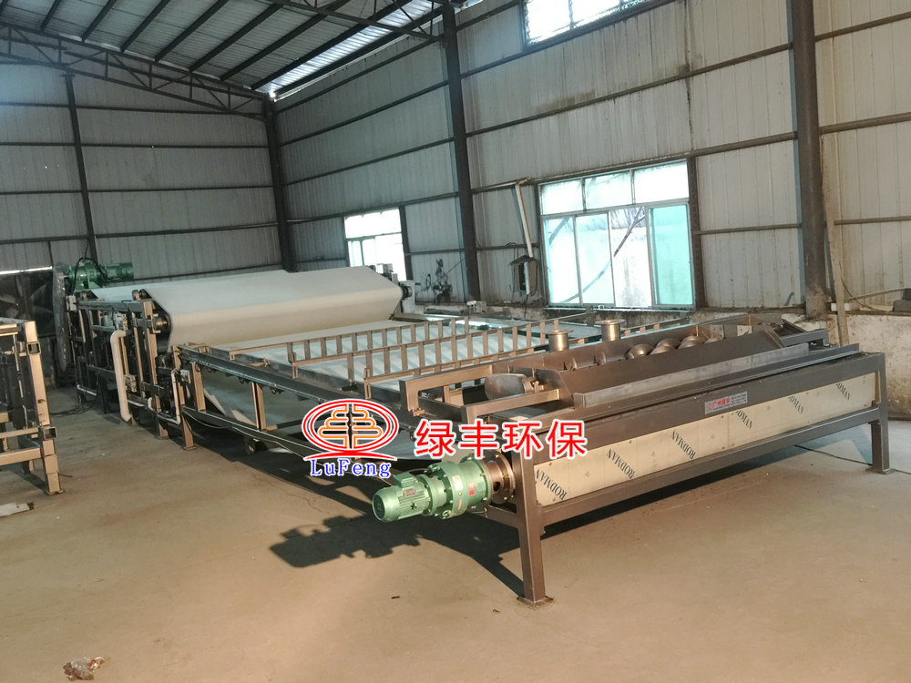 泥漿經輸送泵進入動(靜)態(tài)混合器,與同時加入的濃度為0.05~0.1%陰(陽)離子絮凝劑溶液相混合并充分反應后,泥漿中的微小固體顆粒(或懸浮物)聚凝成體積較大的絮狀團塊,物料間的結合水及表面水被分離成自由水,當物料被輸送鋪展到加長的重力預脫水區(qū)(或帶式濃縮機上)的濾網上,在重力的作用下自由水透過濾網背面而滲出分離,形成不流動狀態(tài)的泥漿,達到壓榨脫水區(qū)實施最大壓力條件,然后隨著網帶的移動而夾持在上下兩條網帶之間,經過具有可調張緊力的過濾帶及直徑逐漸遞減的轉輥和對壓輥,實施連續(xù)增加的緩慢的對輥擠壓力、剪切力作用,通過楔形區(qū)、低壓區(qū)、中壓區(qū)、高壓區(qū)和強力對輥擠夾區(qū)將泥漿中的水份經過逐級增壓的方式不斷擠壓出來,最后形成含水率較低的濾餅排出,通過刮料板刮離,上下濾帶分開,經過高壓沖洗水及滾刷清除濾網表面孔隙中的微量顆粒,繼續(xù)進入下一步脫水循環(huán)。