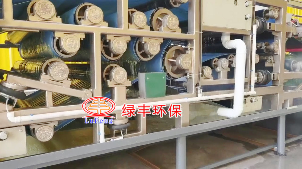 本系統(tǒng)設(shè)備組成為:①主機(jī)(脫水機(jī)主體)②空氣壓縮機(jī)③電器控制柜④網(wǎng)帶清洗水泵⑤進(jìn)料和出料輔助裝置。其中主機(jī)部分主要由機(jī)架、上下驅(qū)動(dòng)輥、傳動(dòng)裝置組合對(duì)輥裝置、上下濾網(wǎng)、張緊裝置、糾編組件、布料裝置、氣控柜、清洗噴嘴、接水槽等組成。